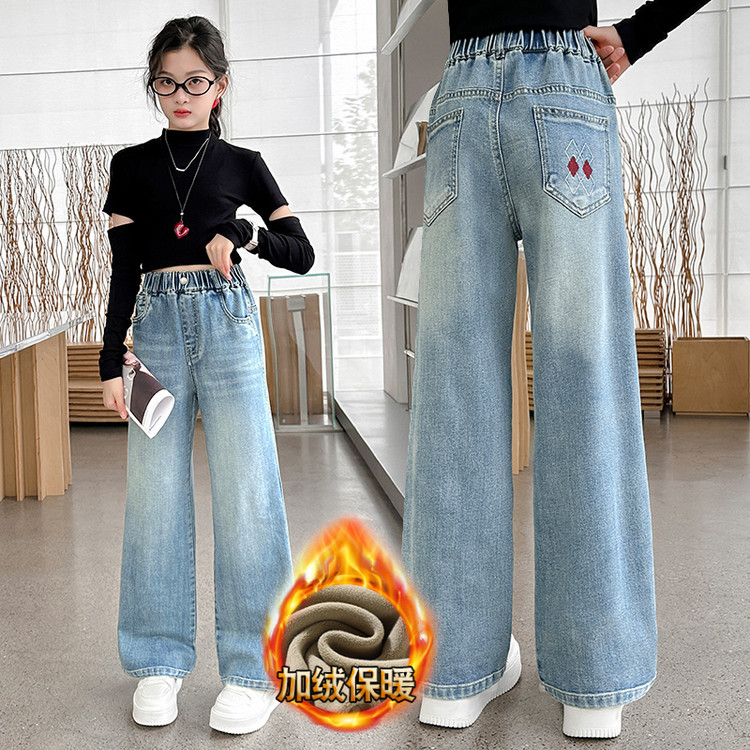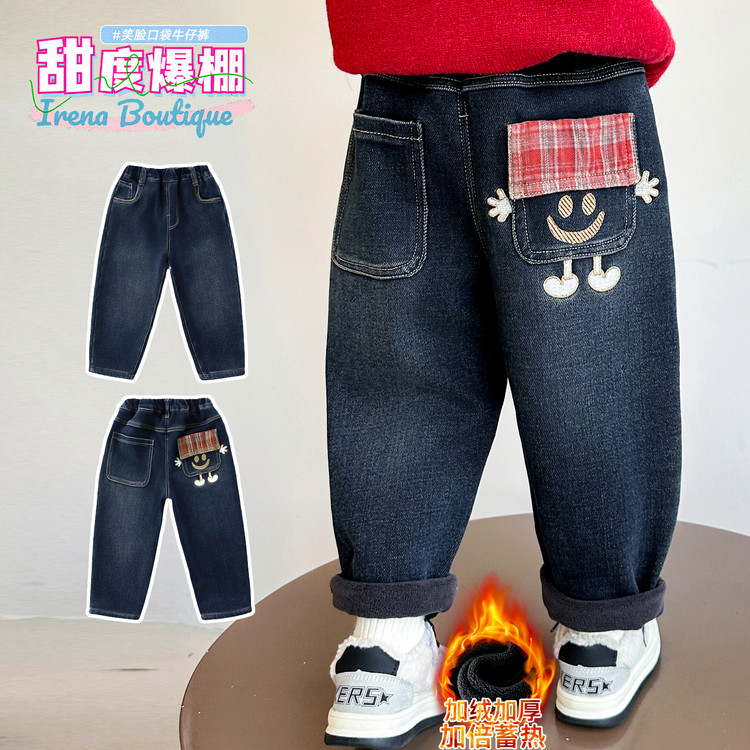 优米家&后口袋笑脸格子加绒牛仔裤