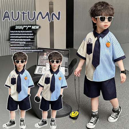 个性下摆小狗条纹T恤屁帘中裤套装爆