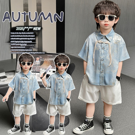 假两件条纹短袖亮钻牛仔直筒裤套装爆
